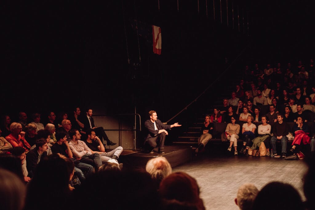 Un comédien se tient debout sur scène et le public l'entoure totalement.